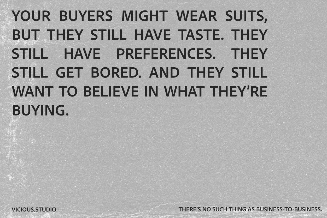 Your buyers might wear suits, but they still have taste. They still have preferences. They still get bored. And they still want to believe in what they’re buying. They want to know your company is made of people who give a damn. Not bots. Not buzzwords. Not 12-point Times New Roman on a page titled “Why Us.”